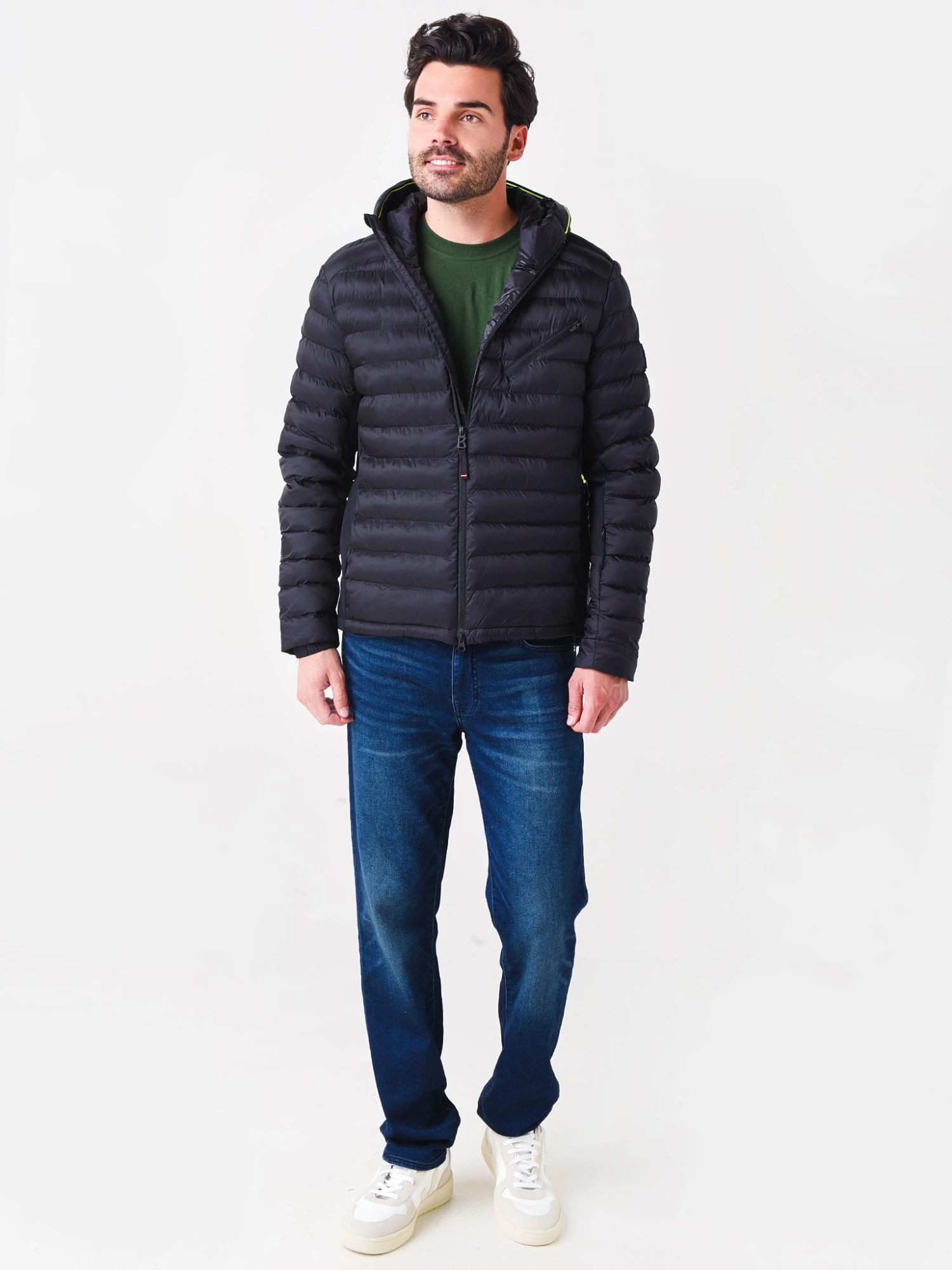 FEATURES:Insulated Padded JacketHoodieChin Guard2-Way ZipperQuilted StitchingPockets: Chest, Sides, Sleeve PocketLong SleeveElastic CuffsLightweight Water-Repellent InsulatingClassic Fit, Straight Hem100% PolyamideModel is wearing size Medium jacket.Model’s Measurements: Height: 6’2″ | Waist: 32″ | Inseam: 33″ | Collar: 15″ | Sleeve: 35″ | Suit: 42L