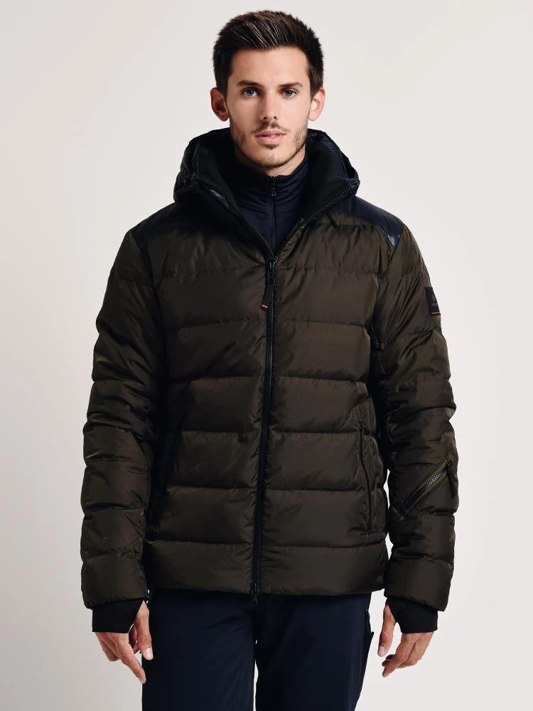 FEATURES:Down jacket in casual bomber stylePadded stand-up collar with soft knit trim insideDetachable hood with drawstringsTwo-way zipper with B logo and pull tabTwo zippered pockets on the front, one ski pass pocket on the sleeveContrasting zippersFIRE+ICE logo on the upper armHardware in matt blackLining in camouflage designOne zippered pocketSnow guard with rubberized finishWaistband with internal drawstringStyled with Bogner Frie + Ice Neal Pant Style # 3410-4282.