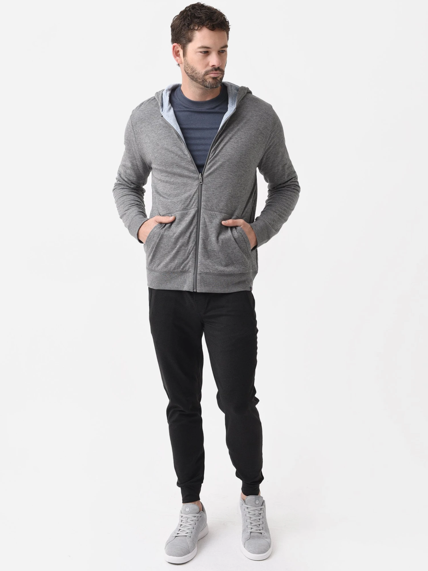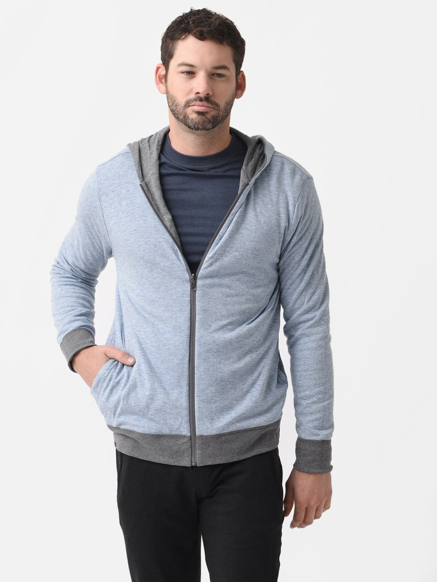 FEATURES:HoodieHigh NecklineLong SleeveKangaroo PocketsFull Zip ClosureSoft FabricationFully ReversibleBanded Cuffs and HemClassic Fit60% Pima Cotton, 40% ModalModel is wearing size Medium hoodie.Model’s Measurements: Height: 6’1.5″ | Waist: 31″ | Inseam: 32″ | Collar: 16″ | Sleeve: 32″ | Suit: 40L