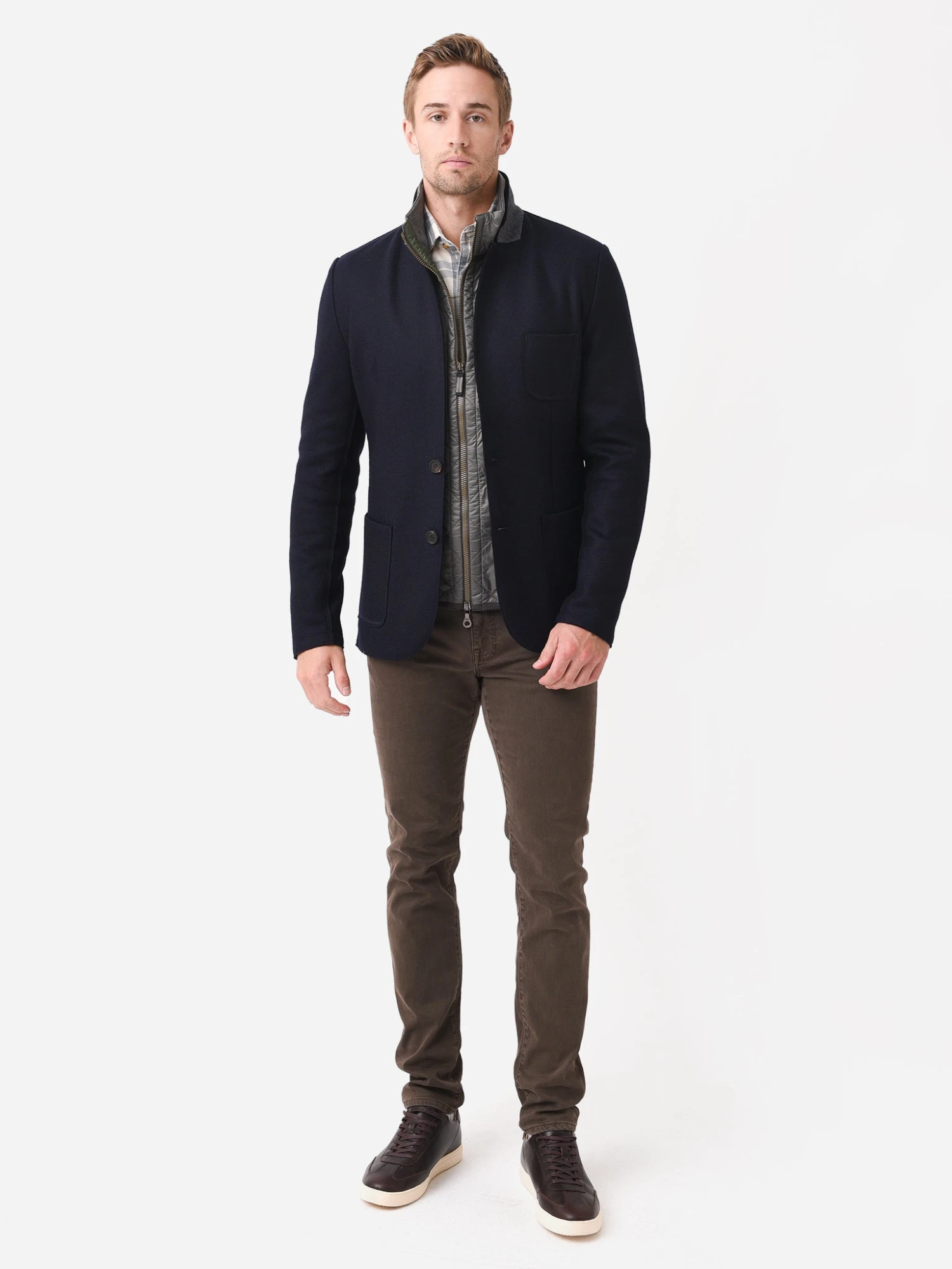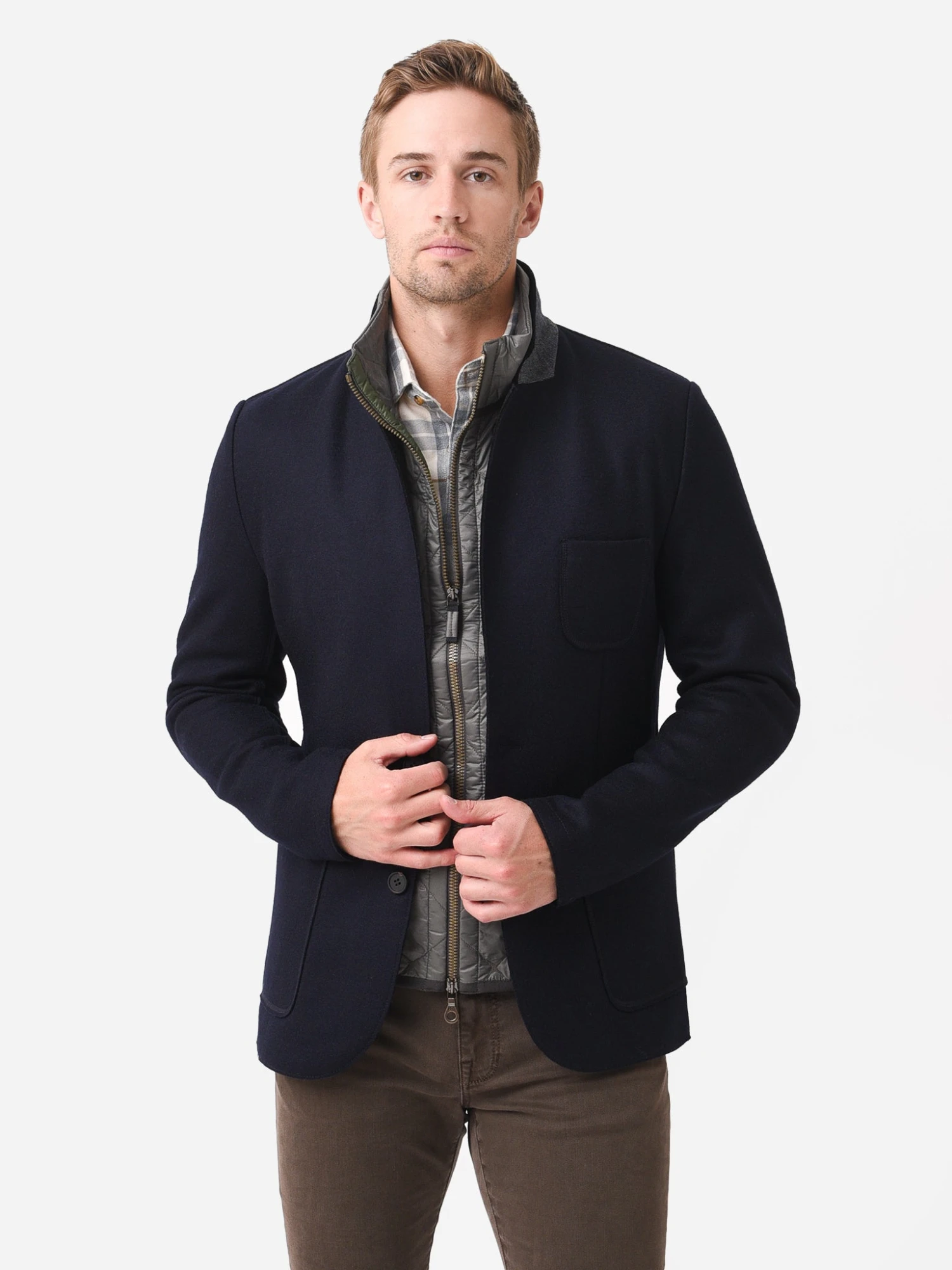 Wool sports coat jacket with open-stitch back detailing.