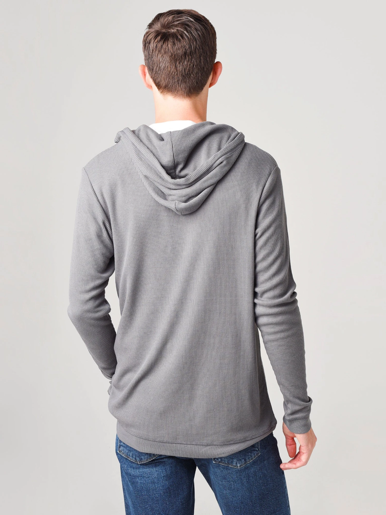 FEATURES:HoodieHooded Neckline with DrawstringHenley 3-Button Placket with Contrast DetailLong SleeveTextured Waffle Knit FabricLight WarmthRegular FitSelf: 70% Viscose from Bamboo, 30% PolyesterModel is wearing size medium hoody.Model’s Measurements: Height: 6’2″; Waist: 30″; Inseam: 34″; Collar: 15.5″; Sleeve: 36″