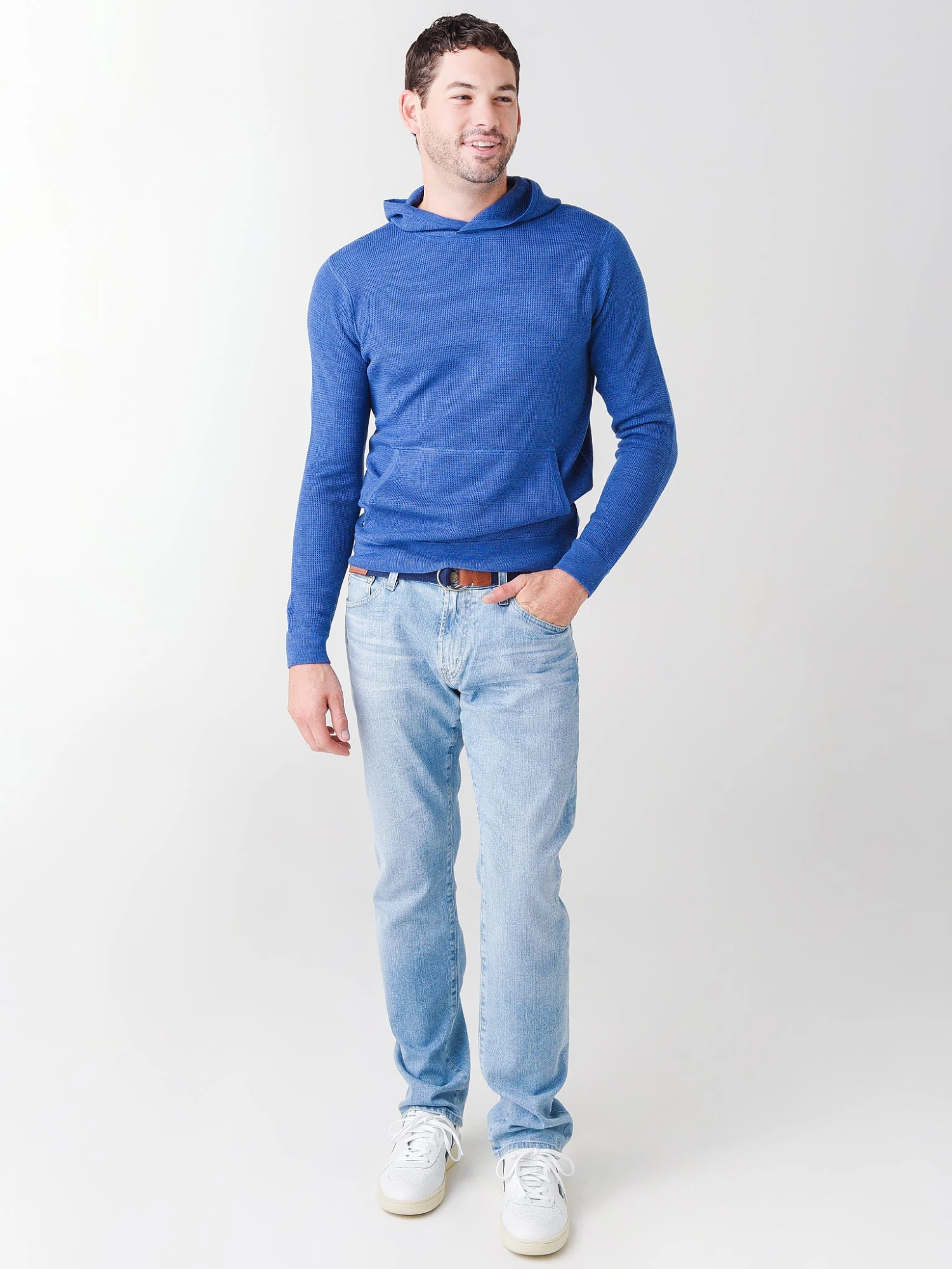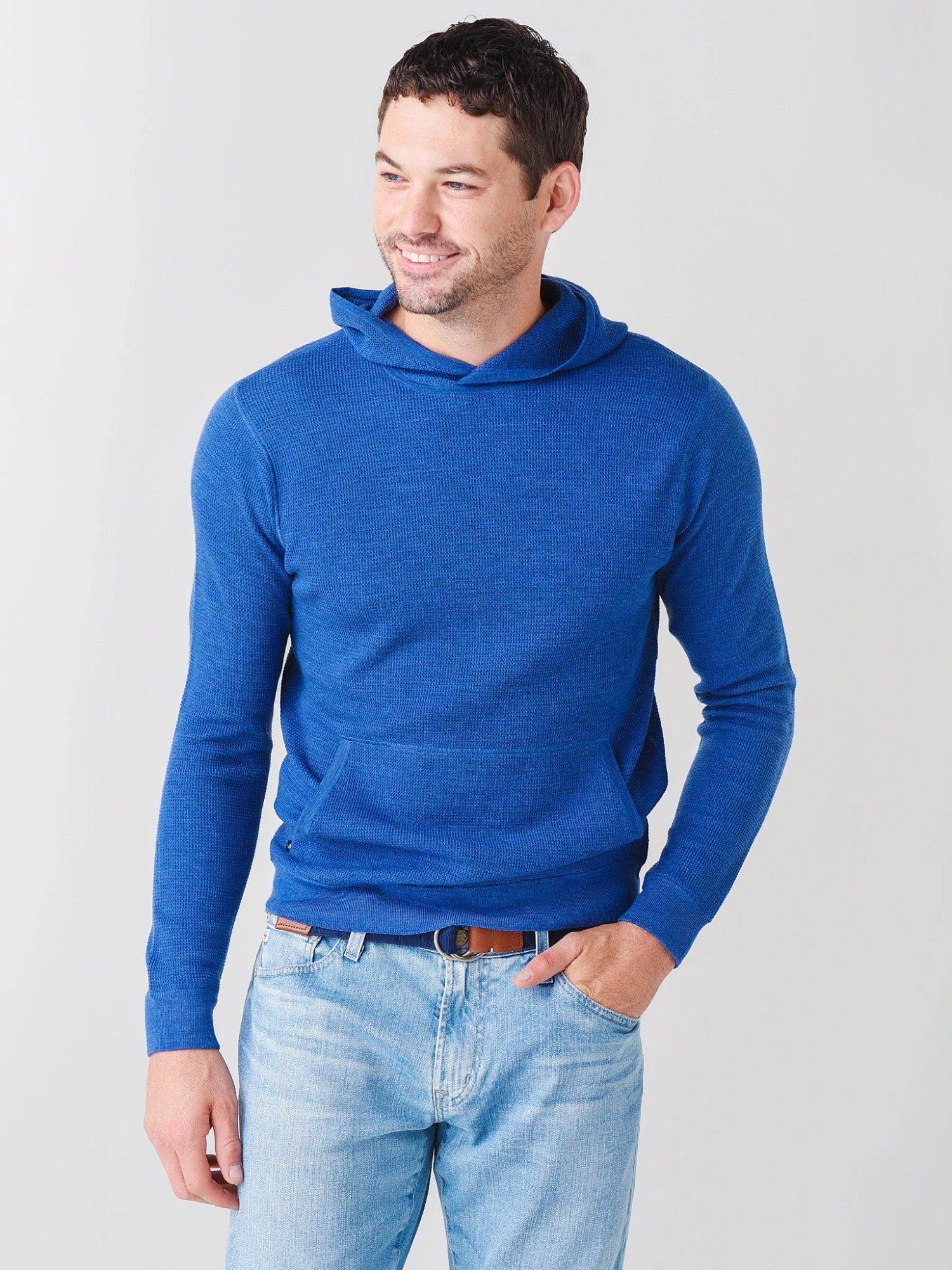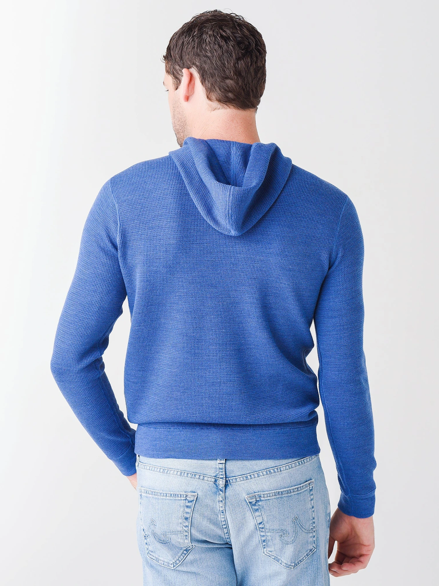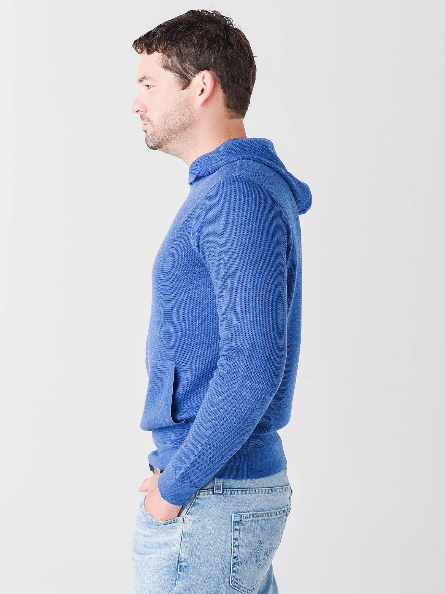 FEATURES:HoodieHigh NecklineAttached HoodLong SleeveKangaroo Front PocketsRib-Knit Cuffs and HemWaffle Knit FabricationSuper SoftTailored Fit100% Merino WoolModel is wearing size Medium hoodie.Model’s Measurements: Height: 6’1.5″; Waist: 31″; Inseam: 32″; Collar: 16″; Sleeve: 32″; Suit: 40L