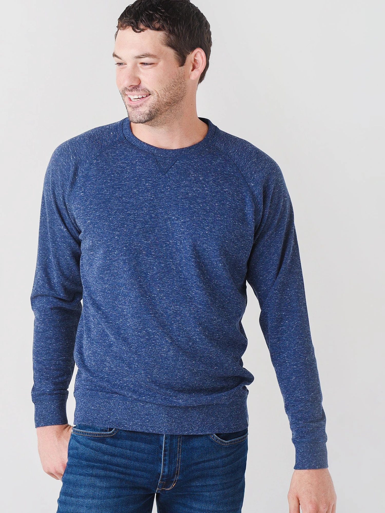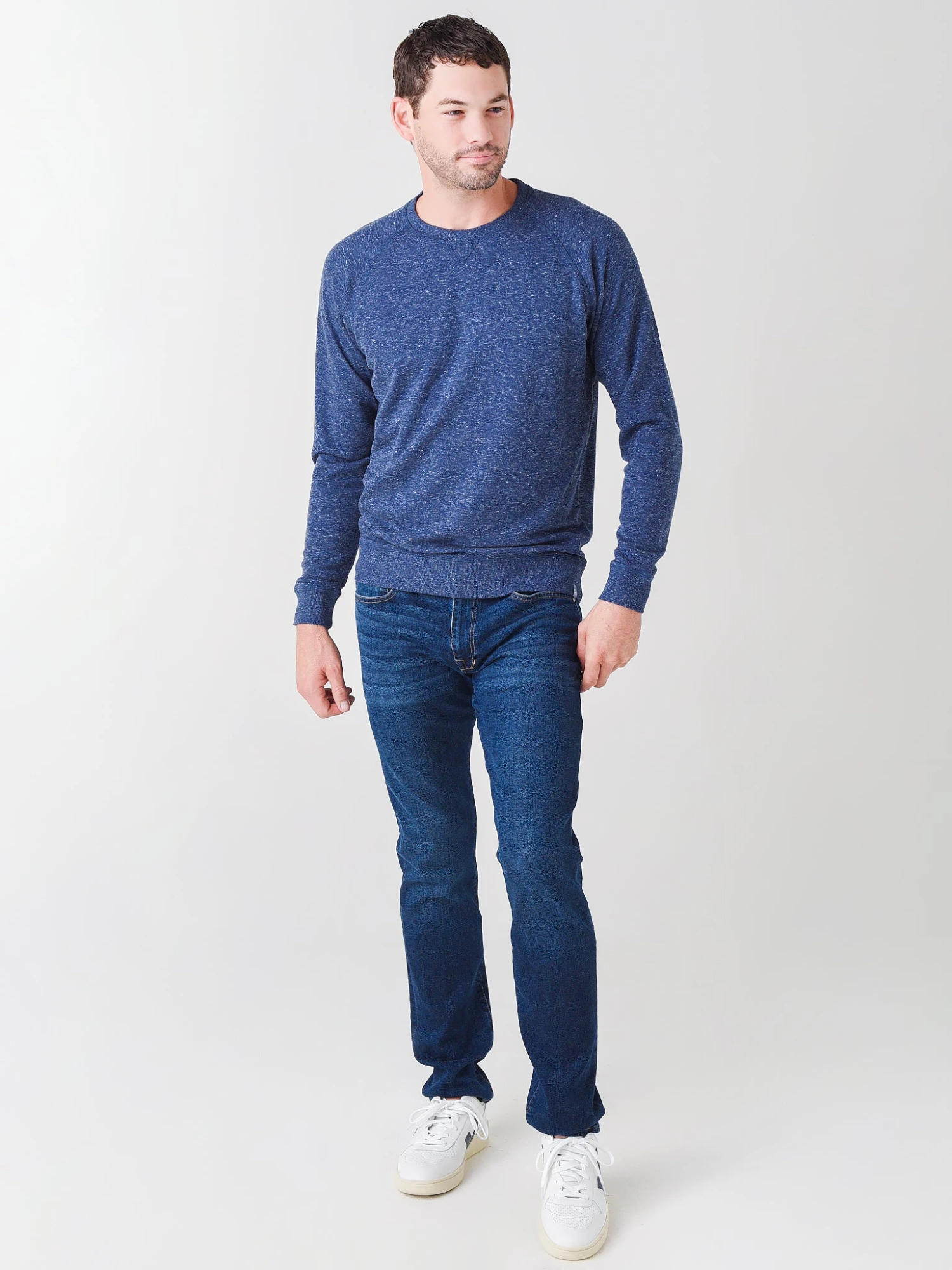 FEATURES:Pullover SweaterCrew NecklineV-Neck StitchingRaglan Long SleeveBarrel Cuff & HemSuper SoftStraight HemClassic Fit55% Cotton, 40% Modal, 5% PolyesterModel is wearing size Medium sweater.Atlantic Blue, Cedar: Model’s Measurements: Height: 6’1.5″; Waist: 31″; Inseam: 32″; Collar: 16″; Sleeve: 32″; Suit: 40L