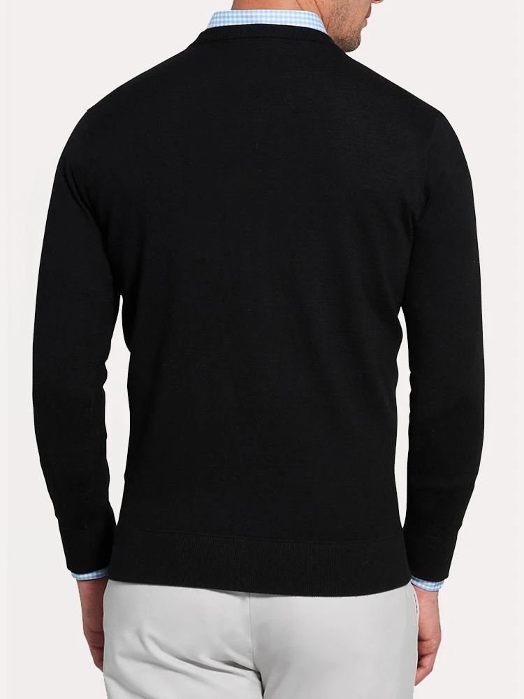 The Crown Comfort Cashmere V-neck Sweater is crafted from luxurious cashmere yarns. The interior of this sweater is poly-plaited, an entirely unique proprietary design that provides moisture management, shape retention and a smooth interior surface for ease of layering. This style is finished with rib-knit cuffs and hem. Pair this sweater with Peter Millar sport shirts for a refined appearance.
