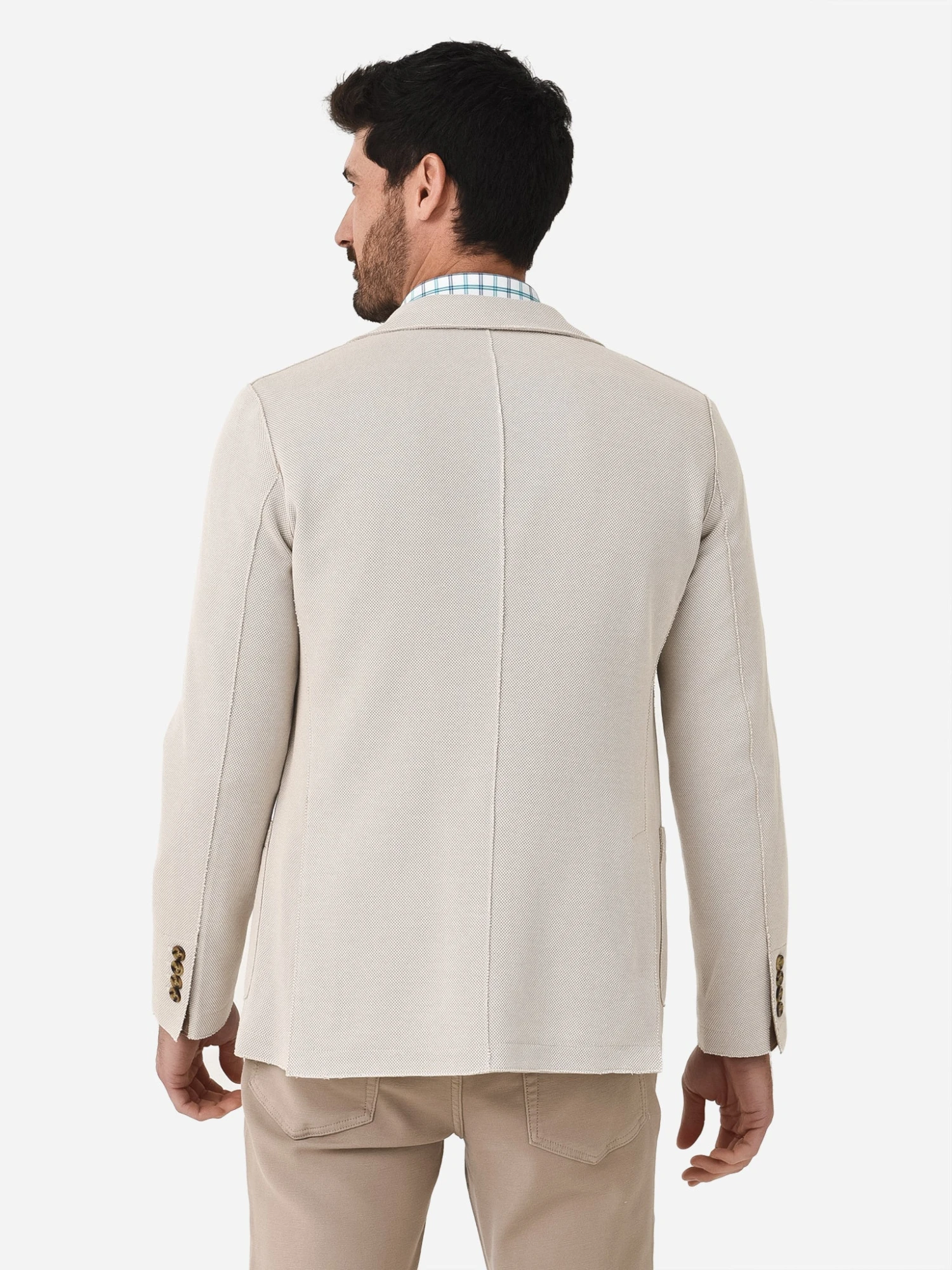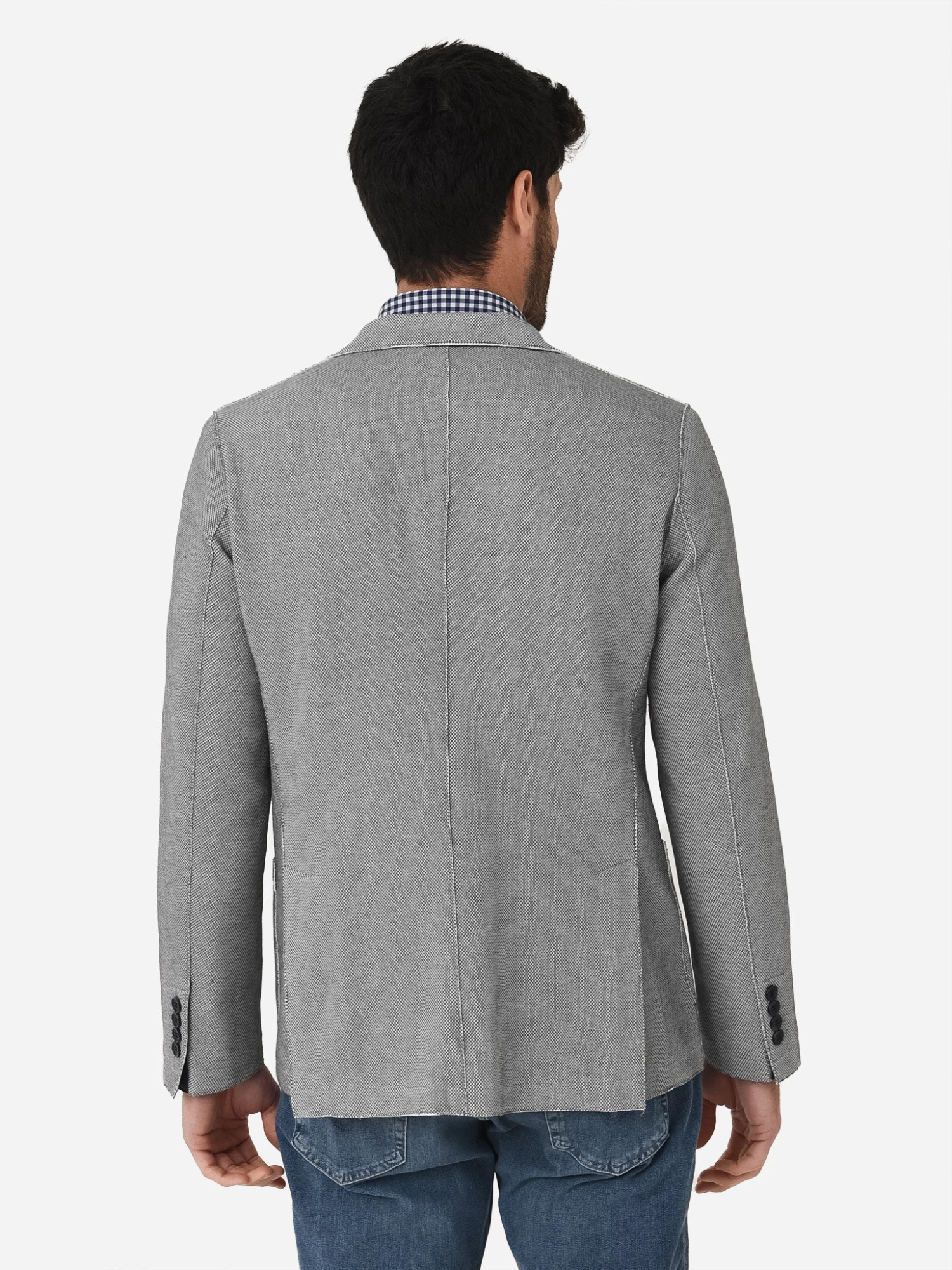 Unconstructed soft jacket made from soft jersey fabric with a travel-friendly design.