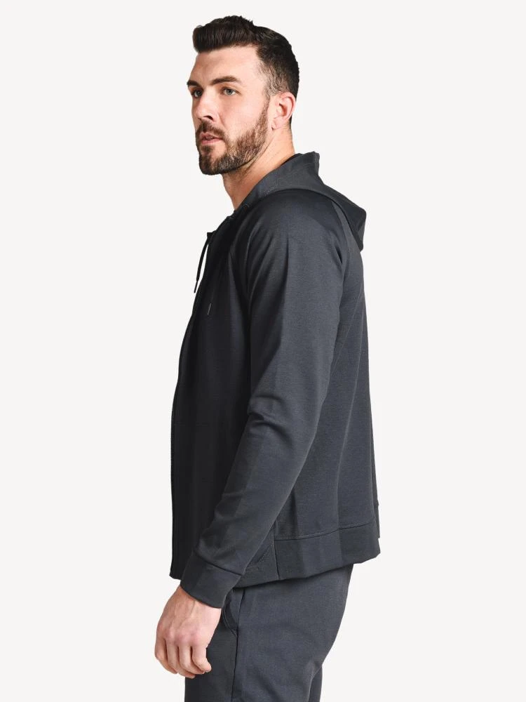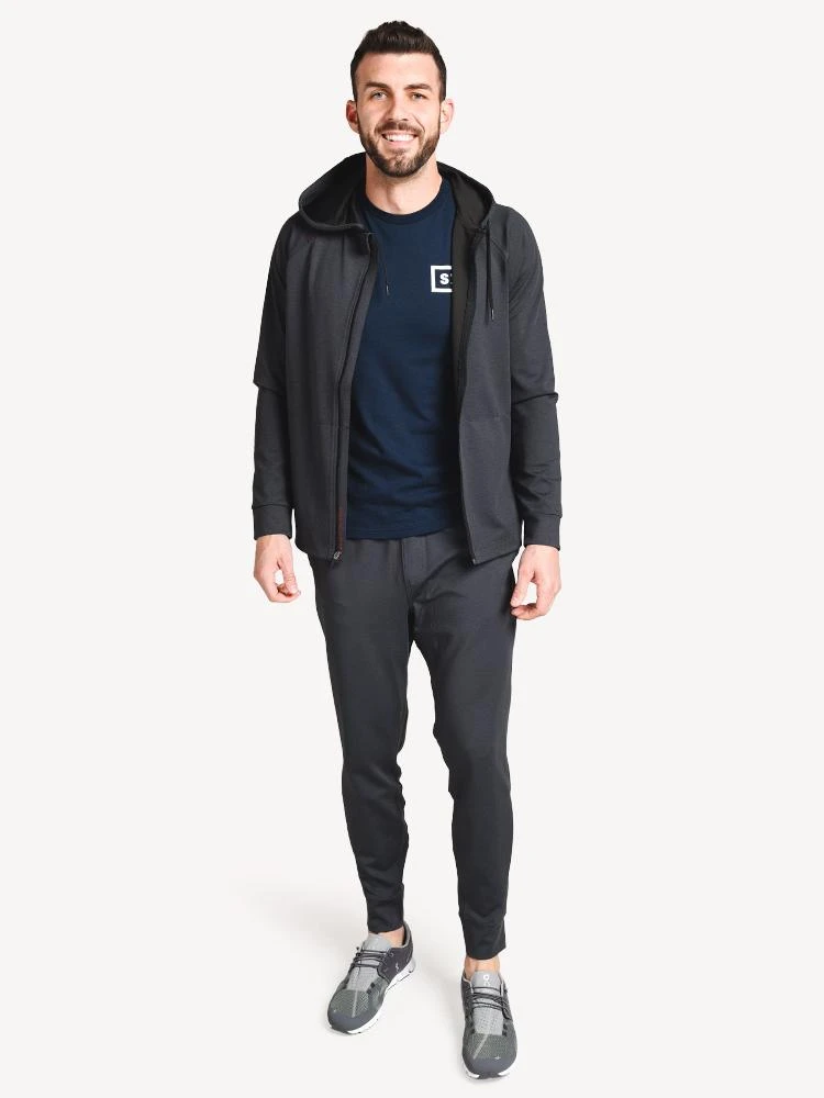 FEATURES:HoodieFull-Zip ClosureActivity: Recovery2 Hand Pockets; Drawcord at HoodMoisture WickingDurableWarm59% Polyester, 28% Nylon, 13% SpandexStyled with Saint Bernard tee style # CIRCLE MOUNTAINS TEE, Rhone jogger style # 100021 and ON running shoe style # MENS CLOUD NEW. Model is wearing size medium hoodie, shirt and jogger.