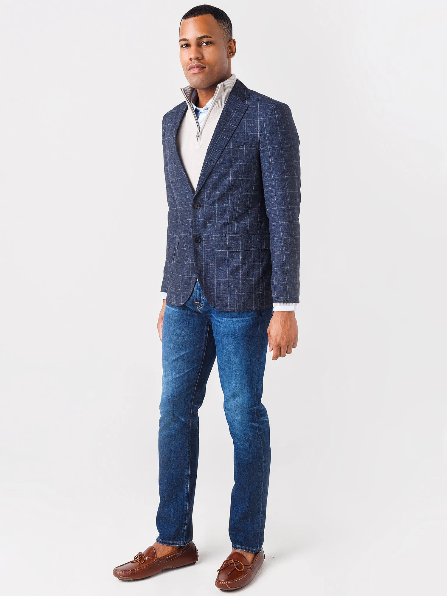 FEATURES:JacketNotch Lapel with Pick StitchingLong SleeveSingle Breasted, Double ButtonTraditional Flap Pockets w/ Pick Stitching4 Internal PocketsWoven in Italy – 66% Wool, 27% Cotton, 7% LinenSports Fit – Fitted Across Chest, Slimmer Through WaistModel is wearing size Medium jacket.Model’s Measurements: Height: 6’3″ | Waist: 32″ | Inseam: 34″ | Collar: 16.5″ | Sleeve: 37″ | Suit: 40L