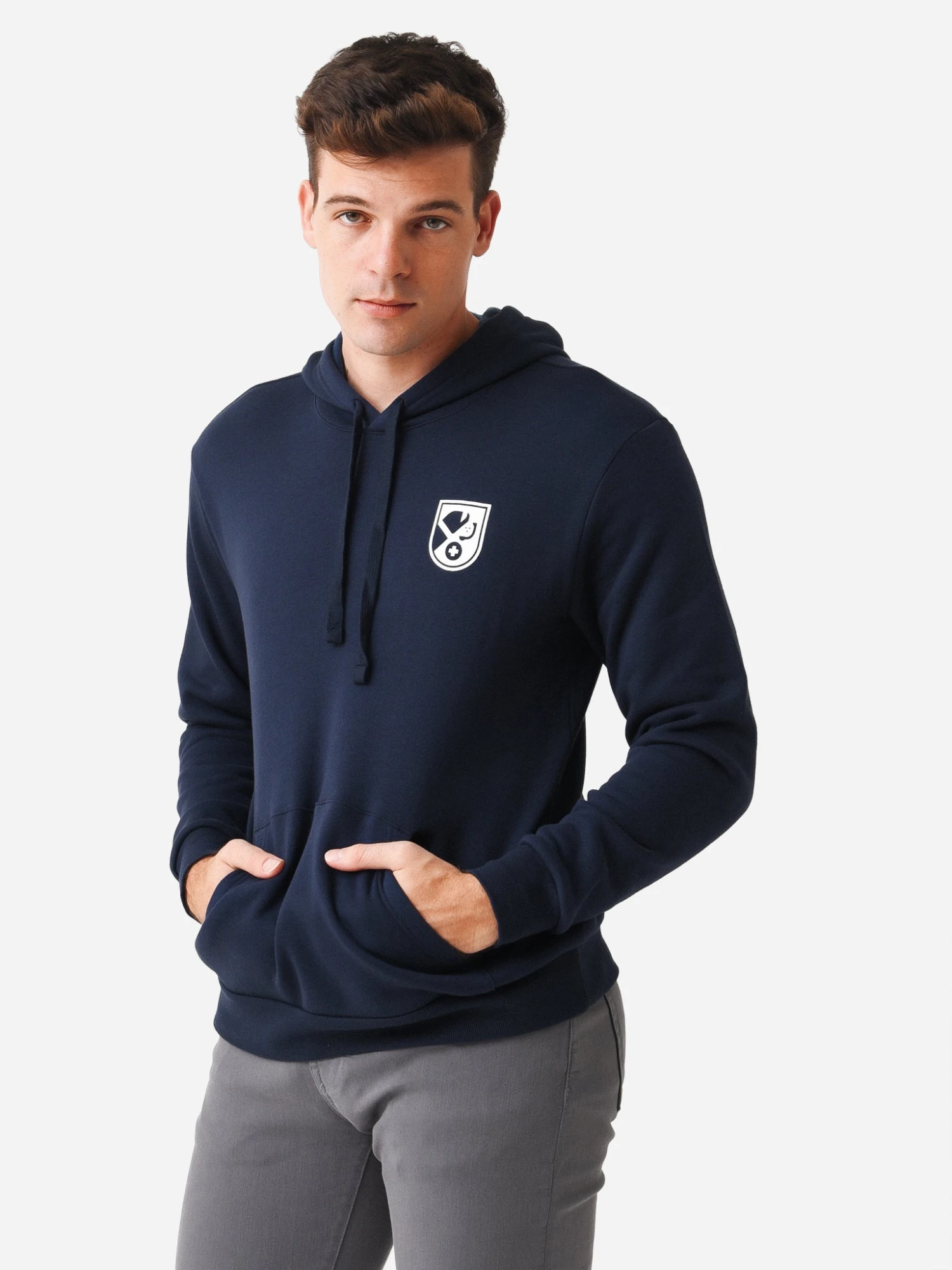 FEATURES:HoodieHigh Neckline with DrawstringsGraphics on Left Chest and BackLong Sleeve Kangaroo PocketBanded Cuffs and HemSoft FabricationClassic Fit70% Cotton, 30% PolyesterModel is wearing size Medium hoodie.Model’s Measurements: Height: 6’0″ | Waist: 32″ | Inseam: 32″ | Collar: 15.5″ | Sleeve: 34″ | Suit: 39L