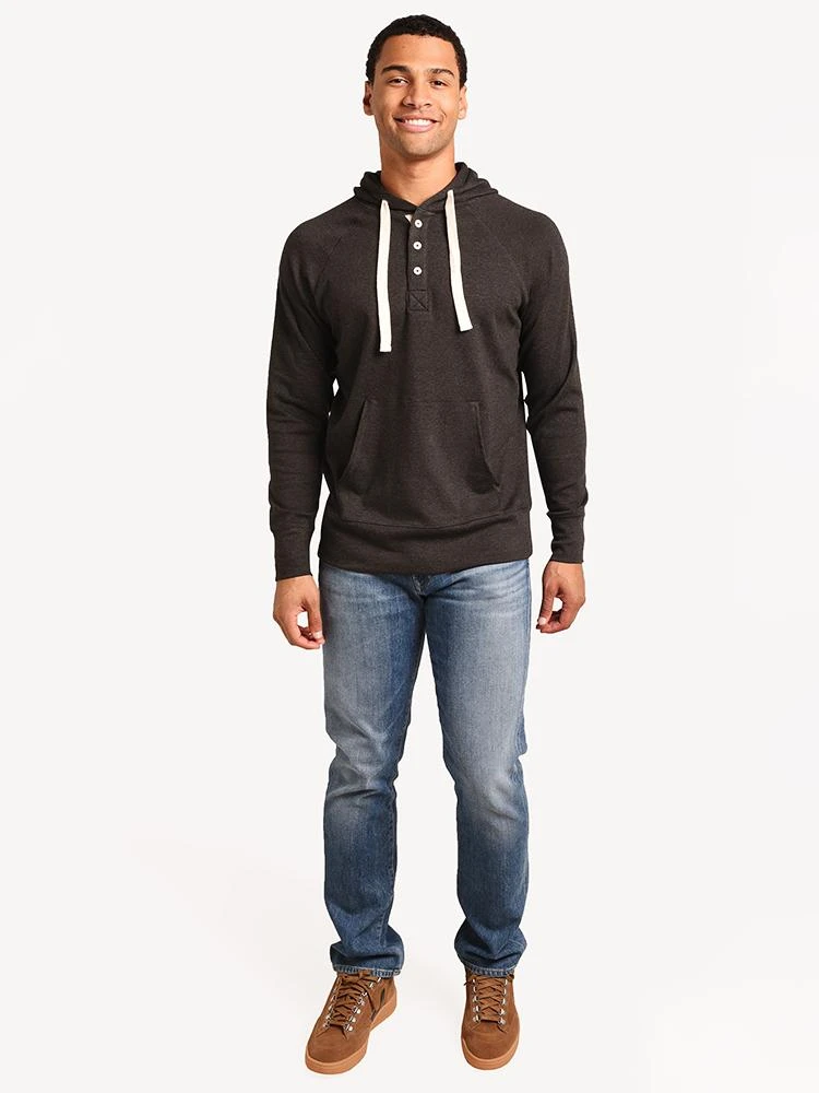 FEATURES:HoodieHenley 3-Button Placket on Neckline1x1 Rib FabricDrawcords at HoodRaglan sleeveKangaaroo PcoketGarment Wash, Silicone Finish58% Cotton, 39% Polyester, 3% SpandexStyled with Citizens of Humanity jean style # 6108B-1147 and VEJA sneaker style # QR031642. Model is wearing size Medium hoodie and size 32 jean.