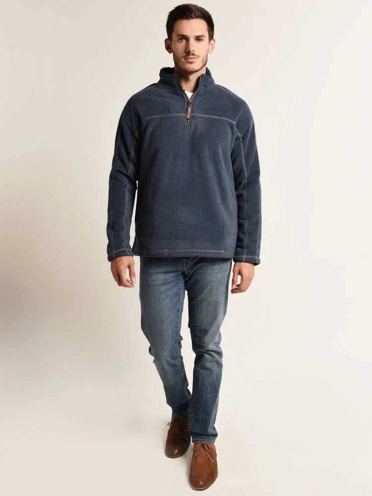 FEATURES:100% polyesterStand collar with contrast interior.Long sleeve feature.Split T-yoke at back.Straight front yoke.Quarter-length zip placket.Machine wash, tumble dry. ImportedStyled with J Brand Jean Style A# JB000171. Model is wearing size medium pullover and 32 jean.