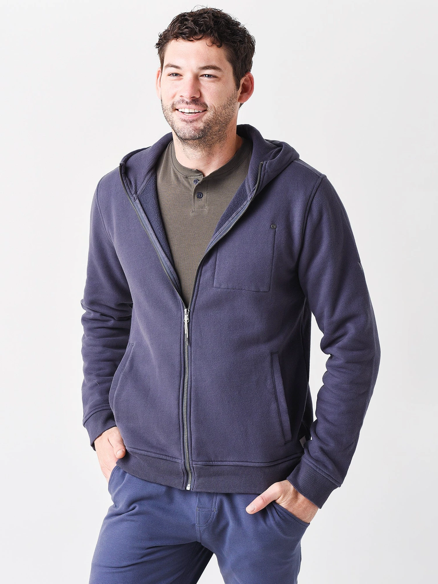 FEATURES:HoodieFront Full Zip ClosureInterior Chest PocketLong SleeveBanded Cuffs and HemFront PocketsUltra Soft Brushed Back Heavy Weight Fleece66% Organic Cotton, 34% PolyesterClassic FitModel is wearing size Medium hoodie.Azure: Model’s Measurements: Height: 6’1.5″ | Waist: 31″ | Inseam: 32″ | Collar: 16″ | Sleeve: 32″ | Suit: 40LSalt: Model’s Measurements: Height: 6’2″ | Waist: 32″ | Inseam: 32″ | Collar: 15.5″ | Sleeve: 35″ | Suit: 38L
